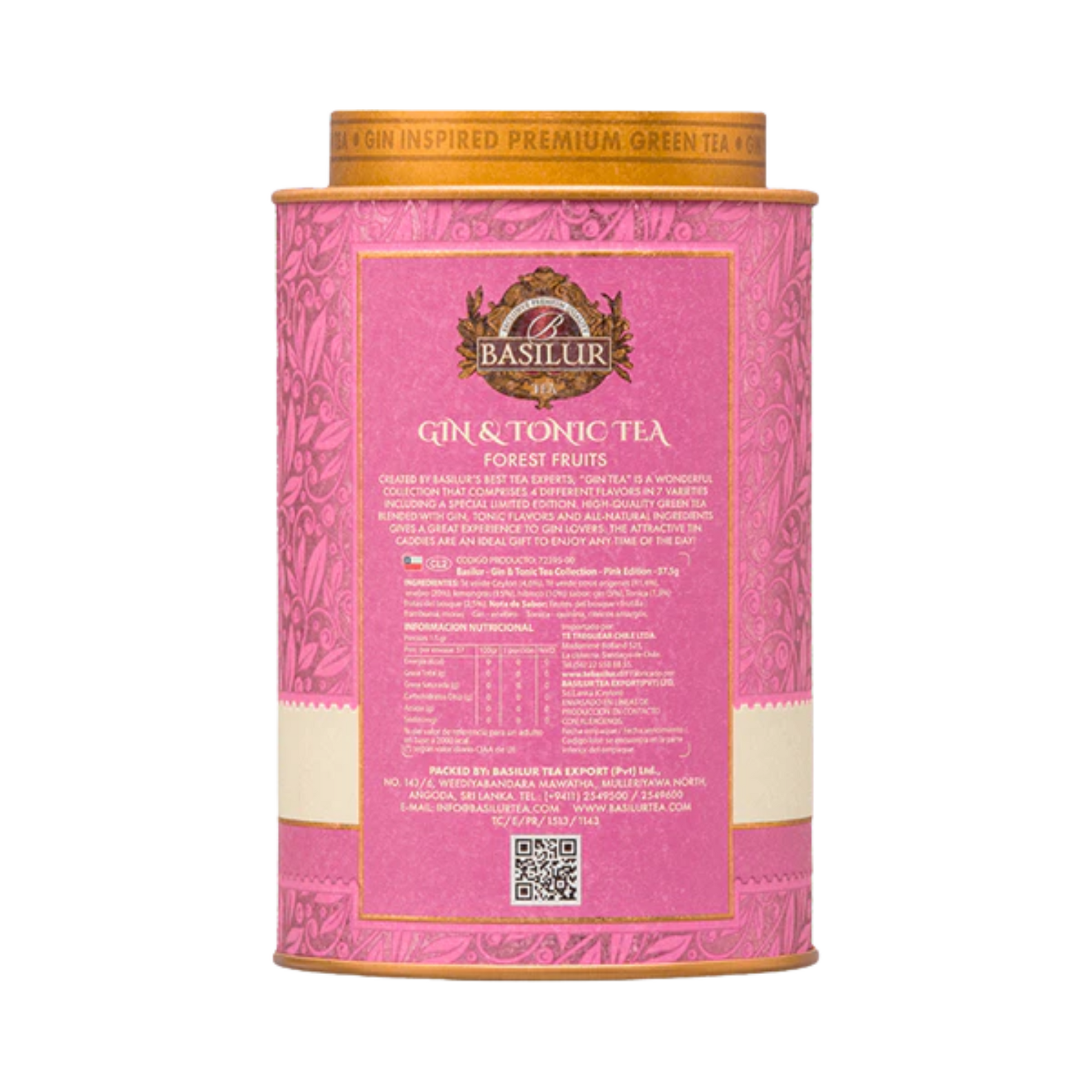 Disfruta del Basilur Gin Tonic Forest Pink en presentación de 25 pirámides, un té premium inspirado en los sabores refrescantes del clásico cóctel. Cada pirámide ofrece una infusión aromática, frutal y equilibrada, ideal para crear momentos únicos y sofisticados. Perfecto para quienes buscan una experiencia gourmet diferente, con sabor intenso y delicado a la vez, transformando cada taza en un instante de placer y distinción.